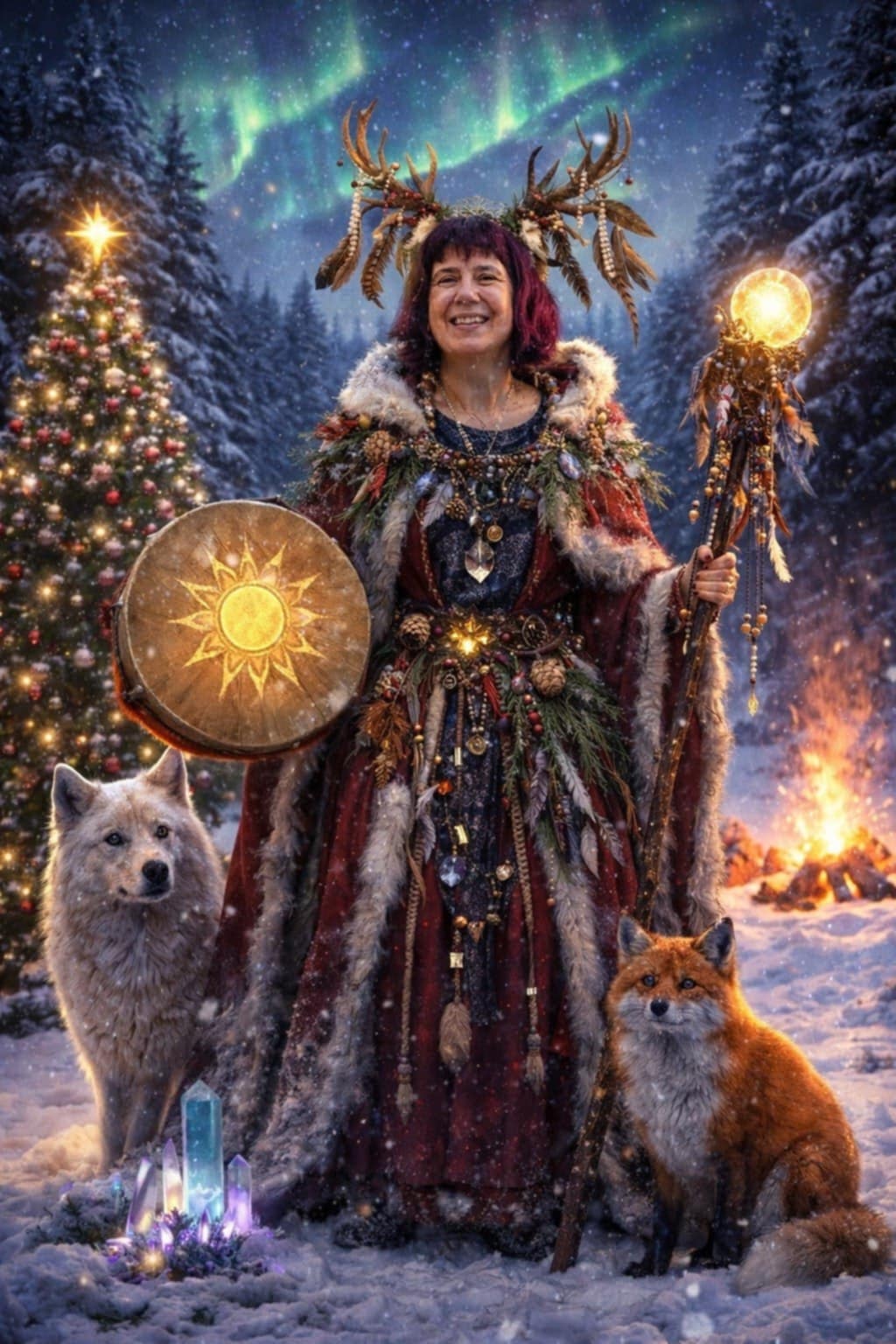 Zij is Moeder Kerstmis. Niet de vriendelijke man met de rode jas, maar het oorspronkelijke verhaal. Een Rendiergodin. De drager van licht. De vrouw met het gewei.