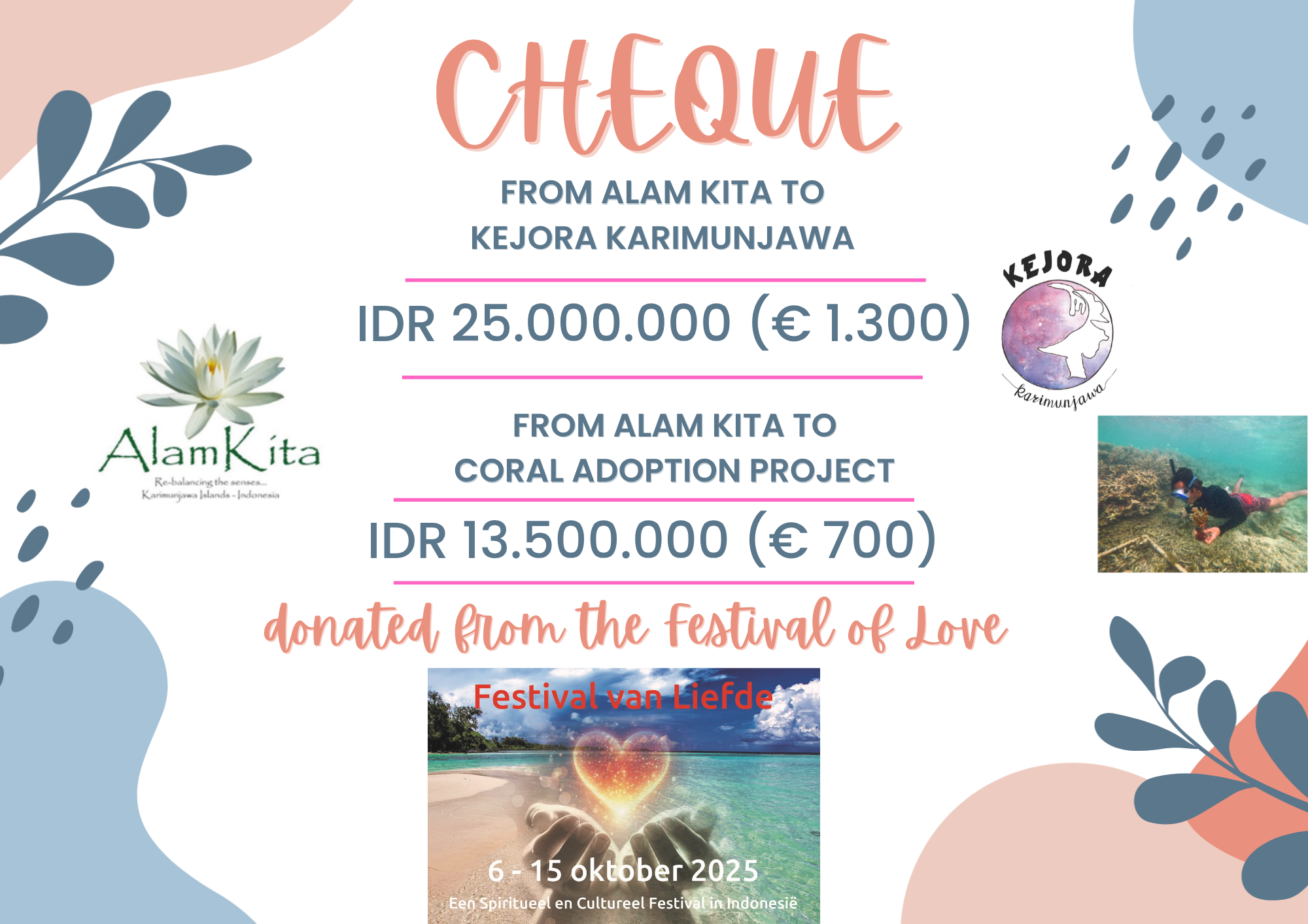 Het Festival van Liefde werkt zonder winstoogmerk. De opbrengsten gaan naar Stichting Keroja Karimunjawa, die de lokale bevolking ondersteunt met o.a. een natuurschool voor kinderen, een taalschool voor volwassenen en het Koraal Adoptie Project, waarbij nieuw leven wordt geplant op bedreigde riffen.